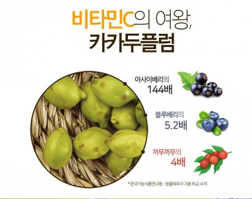 카카두플럼은 비타민C 함유량이 비타민 열매의약 158배, 아사이베리의 약 563배, 오렌지의 약 163배, 레몬의 약 206배 보다 많은 천연 비타민C가 다량으로 함유되어 있다고 합니다.