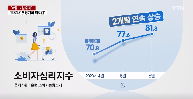 이는 실질적인 소비자심리지수 상승보다는 긴급재난 지원금이 5월에 지급되어 소비로 이어지고 있어 그래프가 상승곡선을 그리고 있는 것이라고 합니다. 8월까지 소비가 이어져 내수시장을 끌어올리는 효과를 볼 수 있을지는 지켜봐야 할 것으로 보입니다.