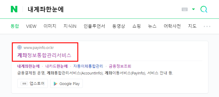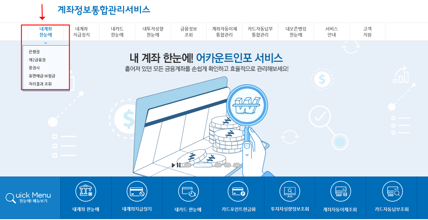 인터넷 검색창에 "내계좌한눈에" 라고 검색을 하면 "계좌정보통합관리서비스" 라고 확인이 되실거에요.