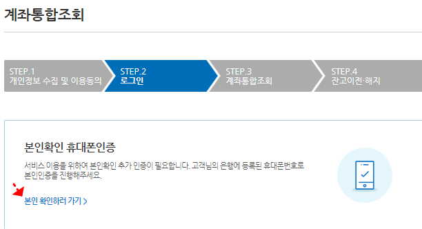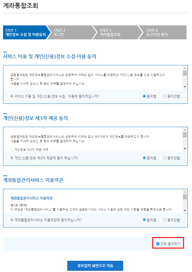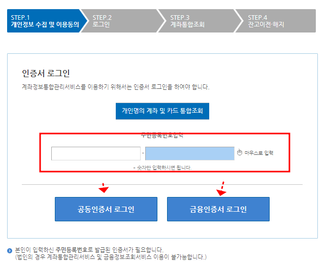 조회를 하기 위해서는 로그인을 해야 합니다. 계좌 통합조회를 위한 개인정보 수집 및 이용동의 후 다음단계로 넘어가 인증서 로그인을 해주시면 됩니다.