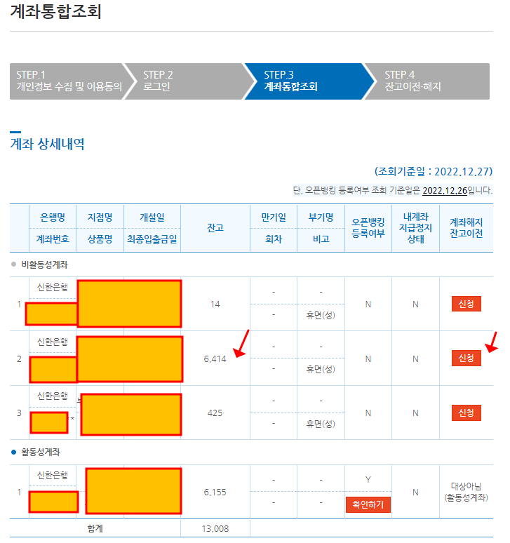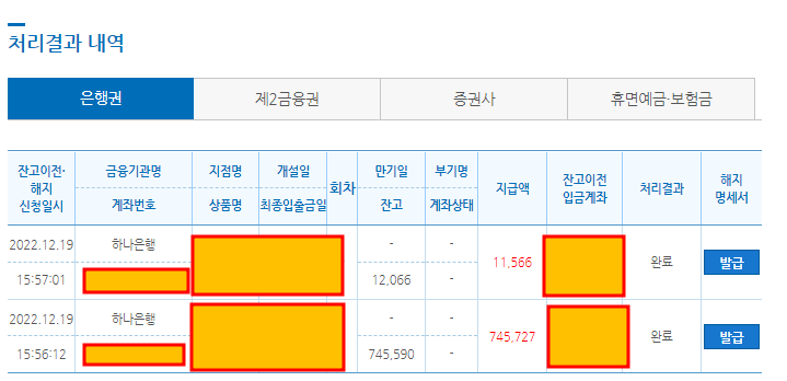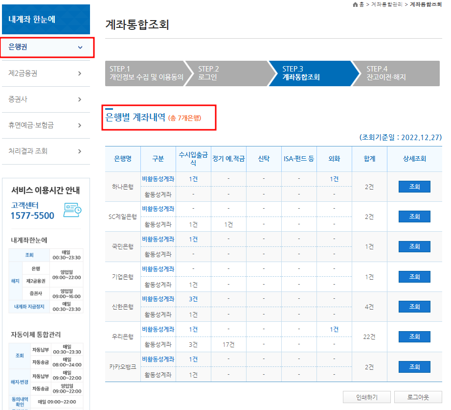 각각 은행별로 "비활동성계좌" 가 있는 곳을 클릭하면 아래와 같이 숨어있는 계좌가 조회가 됩니다.