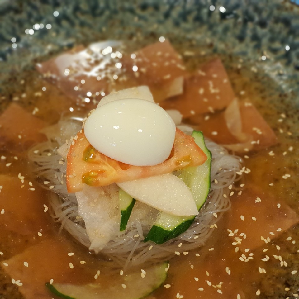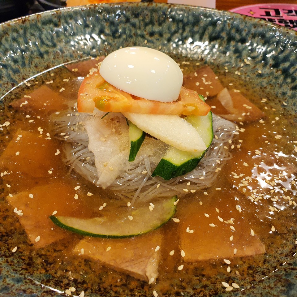 수육을 빙 둘러서 깔아주고 맑은 육수를 부어 기본의 맛을 느끼게 해주는 냉면입니다.