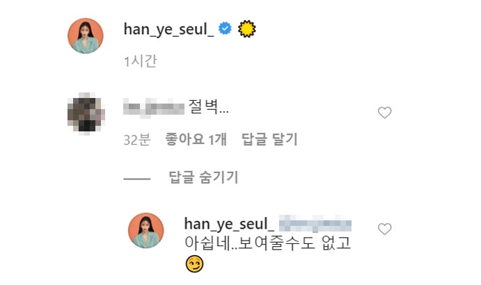 악플러가 '절벽'이라는 댓글을 달자 한예슬은 '아쉽네.. 보여줄 수도 없고.. ' 라며 센스있게 시원하게 대응을 한 것이지요.