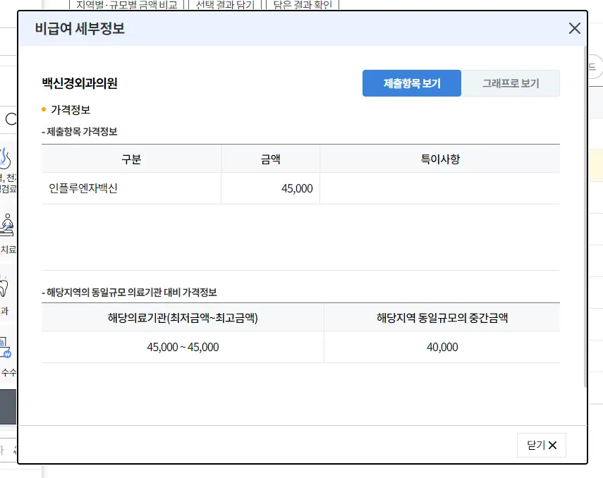 - 본인이 예방접종 하고 싶은 지역, 의료기관 규모를 선택, 비급여 진료비 항목에는 인플루엔자라고 입력 후 돋보기를 누르면 예방접종료 선택창이 나오는데 인플루엔자(독감) 네모 박스를 선택 후 선택항목 검색
