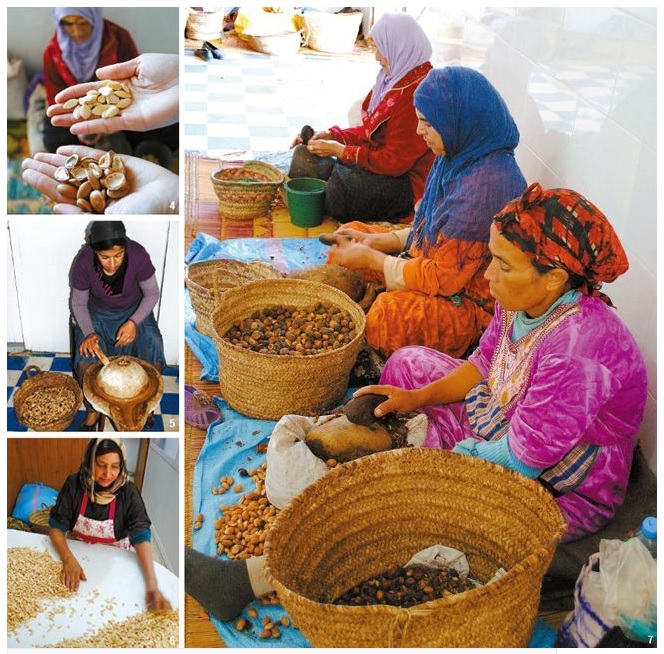 : 아르간 열매 세척 -> 열매의 씨앗 속 커넬 추출 -> 커넬 건조 -> 로스팅 -> 냉압착 방식을 통해 오일 추출.