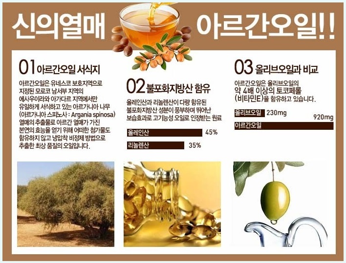 하늘이 내린 황금열매이라고 부르는 열매 추출물인 아르간오일은 뷰티 제품으로 많이 알려져 있지만 예로부터 약용으로 사용을 해 오고 있는 영양분이 풍부한 오일입니다.