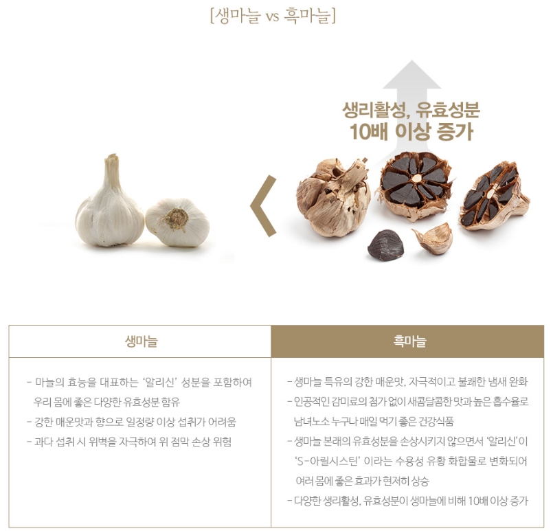 이 발효과정에서 생마늘의 알라신이라는 성분이 SAC (S-아릴시스테인) 으로 변화되어 여러 효능에 도움을 주고 발효되면서 생마늘의 맵고 쓴 맛이 사라지고 영양성분이 농축되어 그 함량을 높여준다고 합니다.