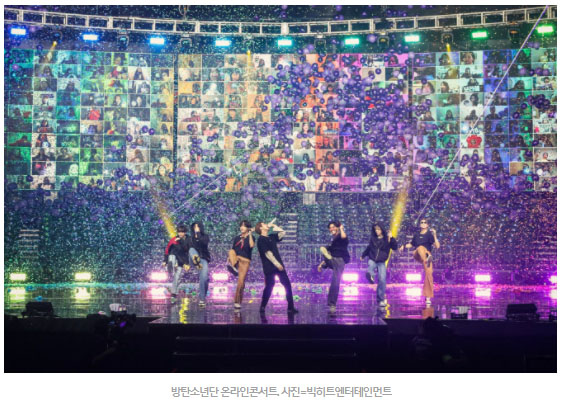 방탄소년단은 온,오프라인 동시에 콘서트를 진행할 예정이었으나, 코로나19 로 인해 라이브 스트리밍 방식으로만 진행이 되었습니다. 온라인 콘서트를 열지 못하는 아쉬움을 달래기위해 증강현실, 확장현실 등의 최첨단 기술을 동원하여 팬들과 소통하고 마주볼 수 있는 '아미 온 에어' 를 도입하여 세계 최초로 라이브 스트리밍 공연에 4K/HD 멀티뷰를 동시에 적용하는 최초의 콘서트 방식을 선보였습니다. IT 강국의 면모를 여실히 보여주었다고 할 수 있습니다.