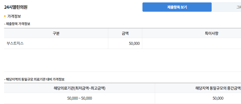 원하는 병원을 선택한 뒤 가격정보란에 '세부'를 누르면 아래와 같이 가격 정보가 나옵니다.