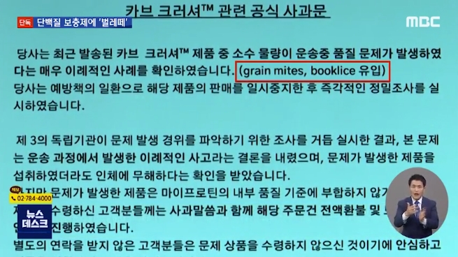 그러나 추후 업체에서 '가루응애'와 '다듬이벌레'라는 벌레의 이름을 표기해 올림으로서 이물질이 벌레라는 것을 알게 된 것이지요.