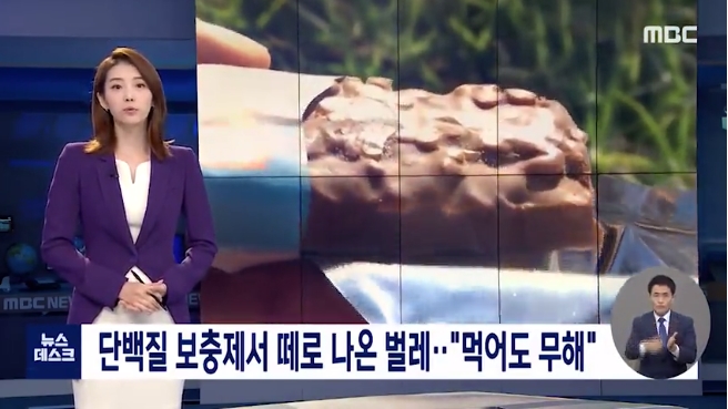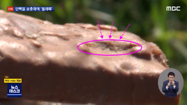 사진에 보이는 것과 같이 초코바 모양의 단백질바에는 하얀 가루 같은 것이 많이 보입니다. 그러나 이 하얀 가루는 1m 정도의 벌레로 자세히 보면 꿈틀거리고 있습니다. 영상을 보고 소름이 돋았지요. 먹는 제품에서 저런 벌레가 한두 개도 아니고 무더기로 득실거리다니.. 분명 문제가 있는 것입니다.