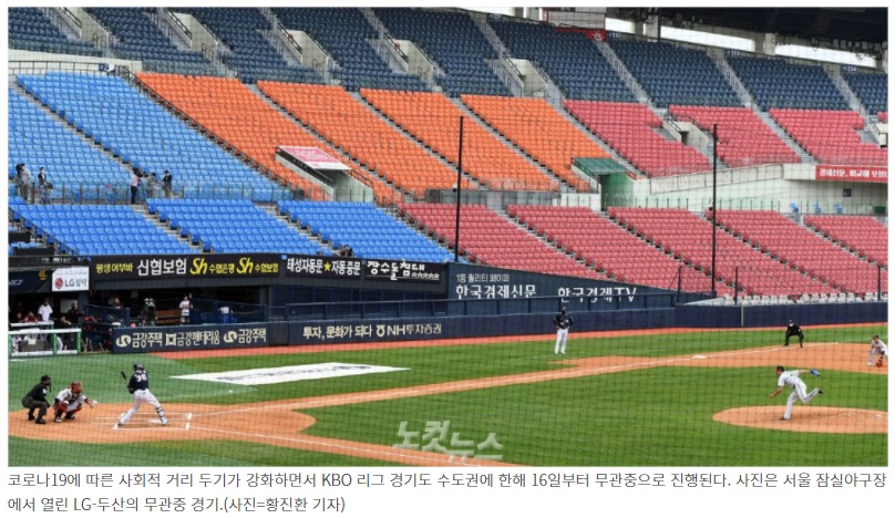 16일 0시부터 코로나 19 서울, 경기지역의 '사회적 거리두기 2단계' 격상으로 인해 프로스포츠 경기는 다시 '무관중' 경기로 진행이 됩니다.