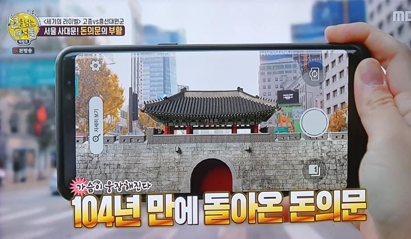 IT강대국입니다. 2019년 8월 20일 돈의문에 대한 증강현실로 복원이 완료되어 터로 알려진 정동사거리에 돈의문 조형물을 설치했다고 합니다. 스마트폰 증강현실 어플을 다운로드하여 실제 돈의문이 있던 정동사거리를 앱으로 보면 현실감 있는 돈의문을 체험할 수 있다고 합니다.