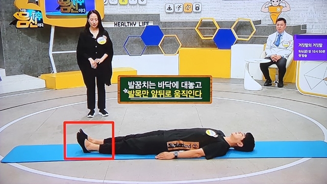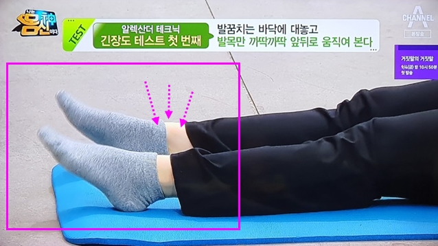 편안히 누워서 발꿈치는 바닥에 대놓고 발목만 까딱까딱 앞뒤로 움직여 봅니다.
