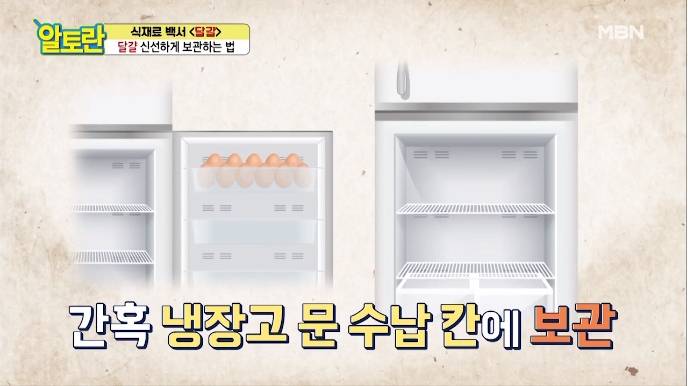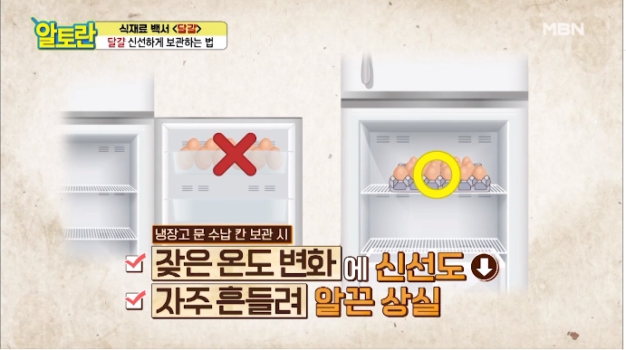 냉장고 문 수납칸에 보관 시, 잦은 온도 변화에 신선도가 떨어지고 자주 흔들려 알끈이가 상실될 수 있다고 합니다