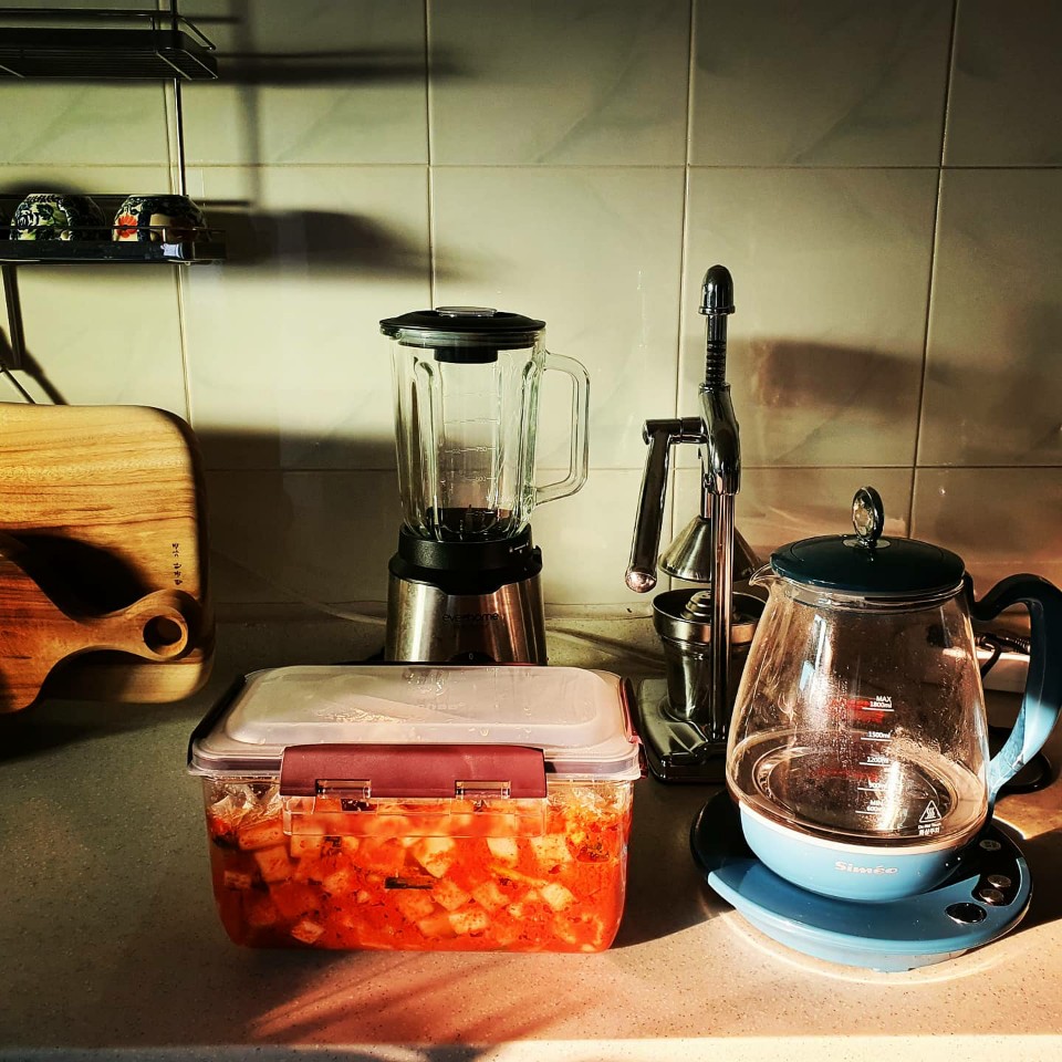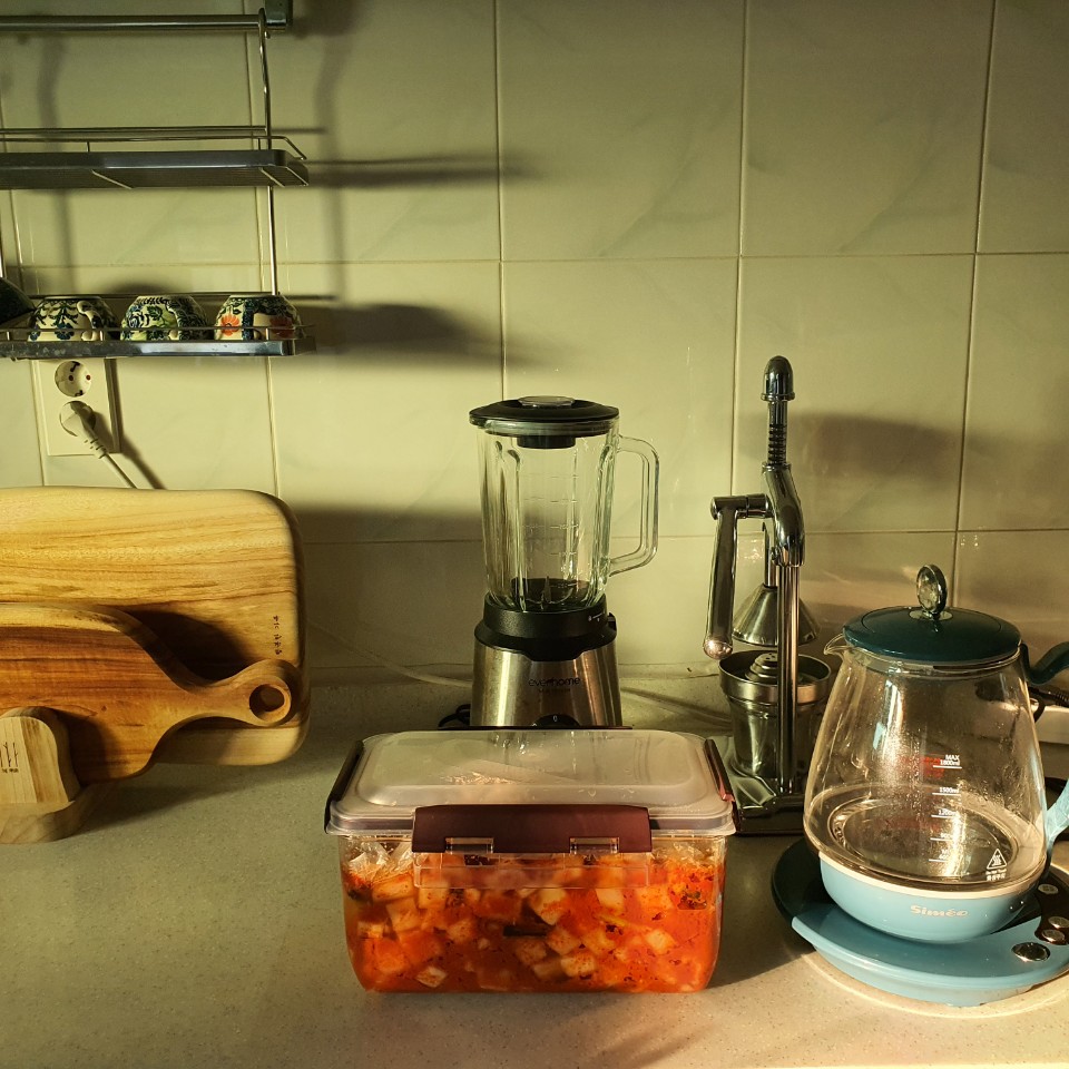 갓 담아 맛있게 익기를 기다리며 두었던 깍두기가 오후의 햇살을 받아 뽀르륵 뽀르륵 익어가고 있습니다.