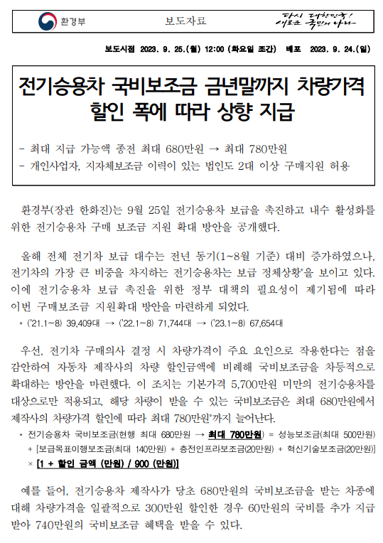 전기승용차 국비보조금 환경부 보도 내용