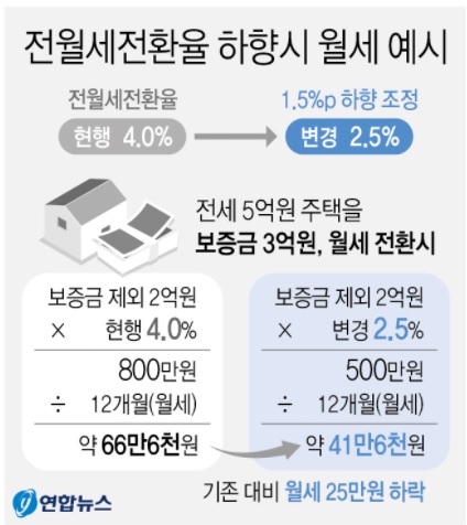 전월세 전환율을 현행 4% 에서 2.5%로 인하한다고 발표를 한 것입니다.