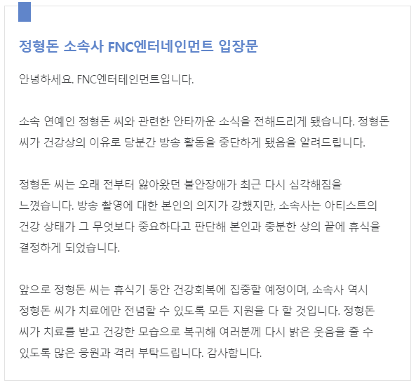 정형돈 소속사인 FNC엔터테인먼트 에서는 오늘 정형돈이 오래전부터 앓아왔던 불안장애가 최근 다시 심각해짐을 느껴 방송 활동을 중단하고 휴식의 시간을 갖기로 결정을 했다고 발표했지요.