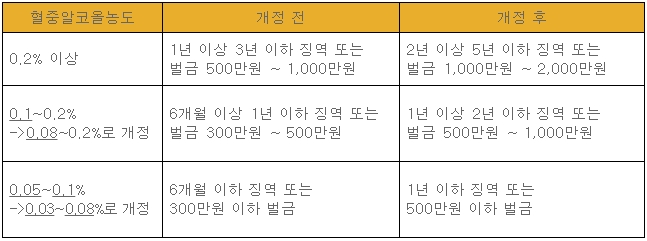 : 이전 0.05% -> 0.03% 낮아짐. (술 한잔만으로도 단속 대상)