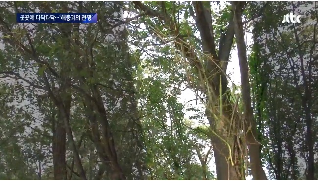 나무의 나뭇잎을 다 갉아 먹고 매달려 있는 모습은 흡사 겨울의 앙상한 나뭇가지를 보는 듯합니다.