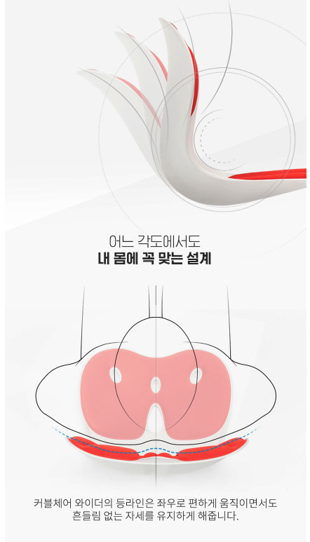 지렛대 원리를 이용하여 앉으면 등받이가 앞으로 당겨지며 자연스럽게 허리를 S자 형태로 잡아주어 안정적인 자세로 앉을 수 있게 한다는 것에 먼저 시선이 갔어요.