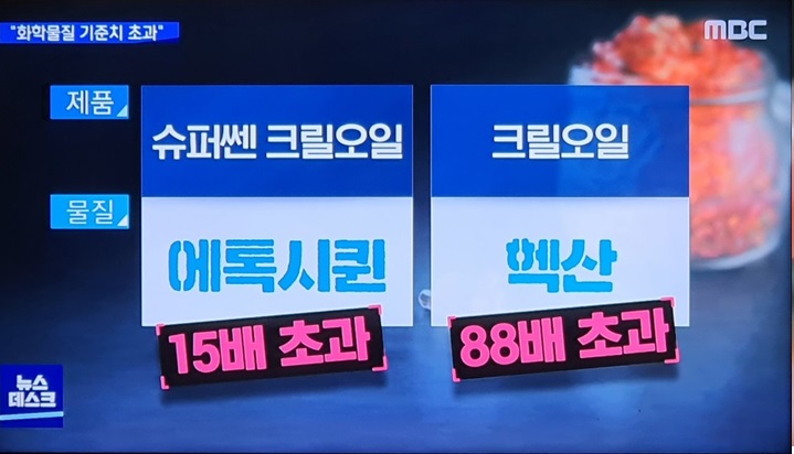 크릴새우에서 기름을 추출하는 과정에서 추출용매 성분이 들어가는데 그중 두 가지 항산화제인 에톡시퀸과 헥산에서 기준치가 넘는 용량이 검출되었습니다.
