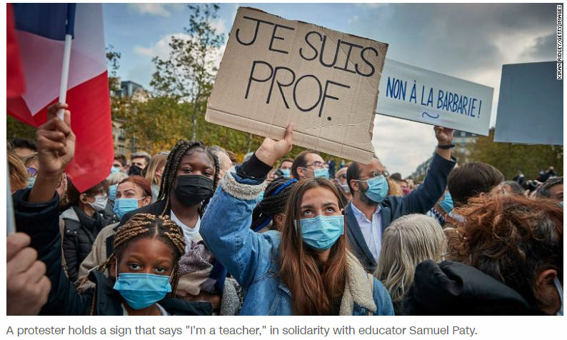 프랑스 중학교 교사 사뮈엘 파티는 역사와 지리 수업 중 이슬람교 선지자 무함마드를 소재로 한 풍자만화를 보여준 교사가 길거리에서 살해당하는 사건이 발생되어 프랑스 사회에 충격과 분노를 일으키고 있습니다.