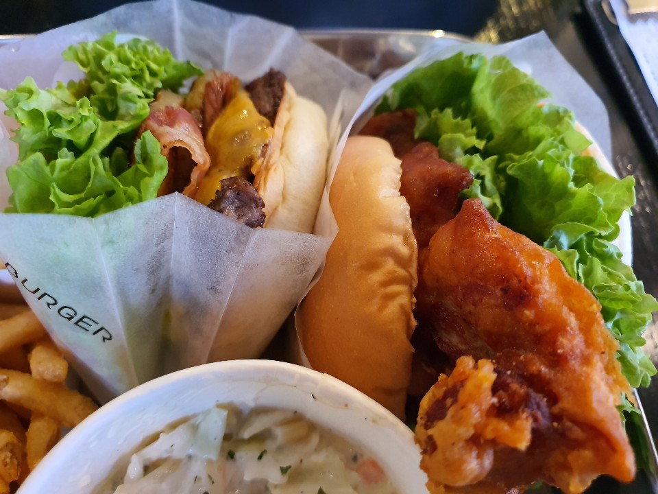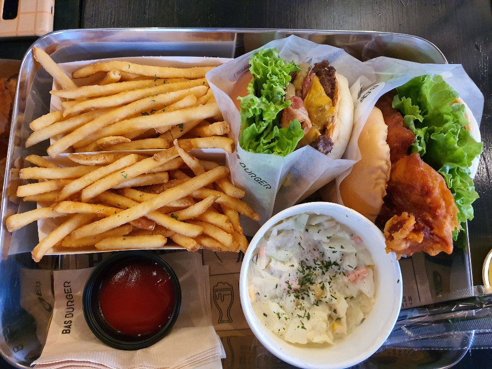 바스치킨버거, 더블치킨버거, 머쉬룸버거, 코운슬로, 감자튀김.. 맥주까지...