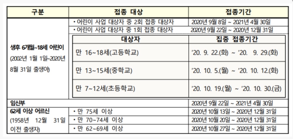 ※ 2020년 추가 독감 무료 접종 대상