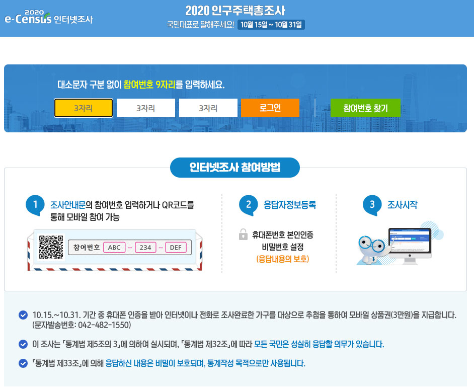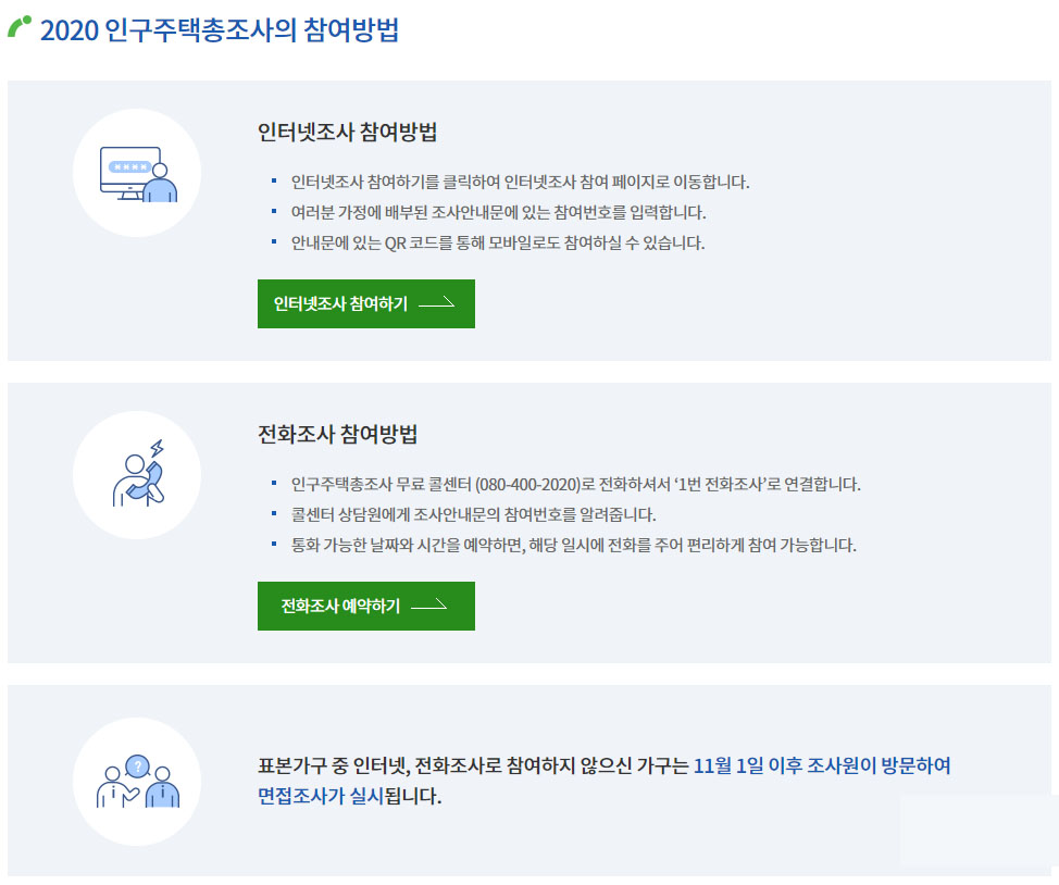 ▶ 인터넷 조사와 전화조사에 참여하지 않은 가구의 경우 11월 1일 이후에는 조사원이 직접 방문하여 진행하는 '방문면접조사'로 참여할 수 있습니다.
