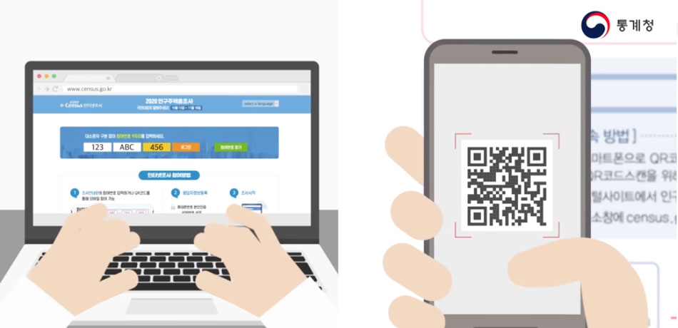 인구주택총조사 사이트 (www.census.go.kr) 접속해 '인터넷조사' 참여 페이지에서 조사안내문에 있는 참여번호 9자리를 입력합니다. 안내문에 있는 QR코드를 활용해 모바일로도 참여할 수 있어요.