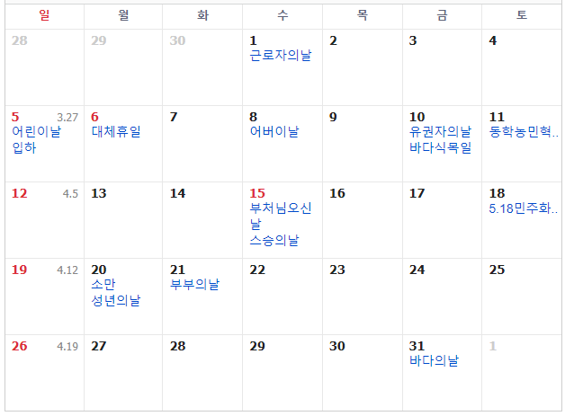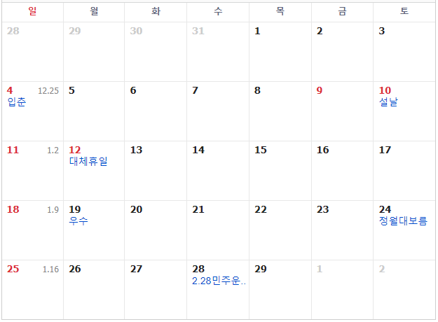 - 대체휴무일은 설날과 어린이날이 일요일과 겹쳐서 2일이 됩니다.